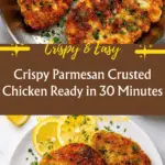 This Parmesan Crusted Chicken recipe features tender, pounded chicken breasts coated in a crispy mixture of Italian bread crumbs, freshly grated Parmigiano-Reggiano, and herbs, then pan-fried to golden perfection. Ready in just 30 minutes, it’s an easy and flavorful dish perfect for a quick weeknight dinner, served with zesty lemon wedges to brighten each bite.