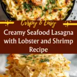 This decadent Seafood Lasagna with Lobster and Shrimp combines tender cooked lobster and shrimp in a creamy, herb-infused sauce layered between tender lasagna noodles, ricotta cheese, and melty mozzarella. Baked until bubbly and golden, this elegant dish offers a luxurious twist on traditional lasagna, perfect for special occasions or a gourmet family dinner.