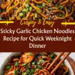 This Sticky Garlic Chicken Noodles recipe features tender chicken pieces coated in a flavorful, sticky garlic-honey sauce, combined with perfectly cooked noodles. The dish delivers a delightful balance of sweet, savory, and mildly spicy notes, garnished with fresh green onions and sesame seeds for a satisfying, restaurant-style meal prepared on the stovetop in just 30 minutes.